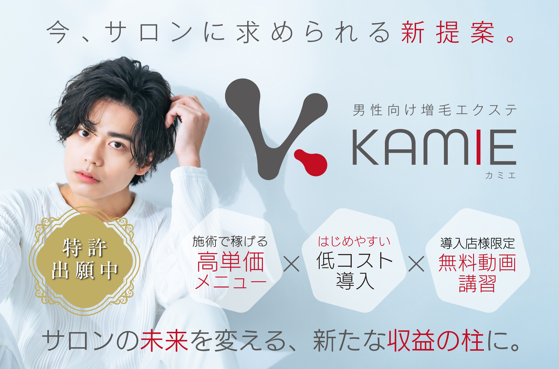 はい。従来の編み込み式エクステでは、短髪の場合に毛がすり抜けやすく、施術が難しいという課題がありました。KAMIEは、今まで実現が難しかった髪が短めな男性への施術もグルーによる接着方式を採用しているため、短髪スタイルの多い男性にも自然に対応できるのが特長です。