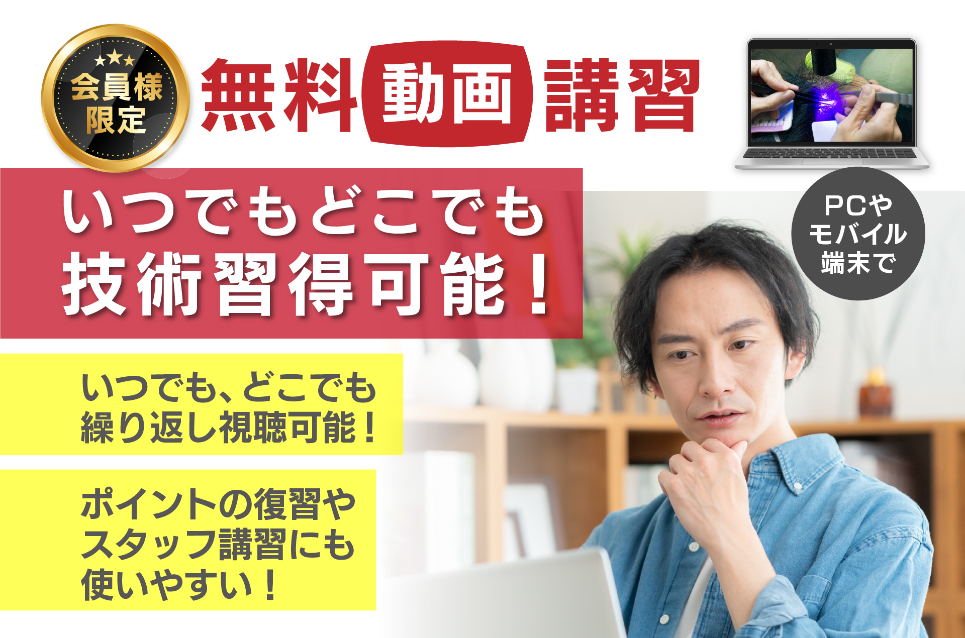 導入サロン様専用の無料動画講習をご用意。場所や時間を選ばず、スマホやPCでいつでも視聴できるので、新しいスタッフの育成や技術の見直しにも活用できます。何度でも繰り返し確認できるため、導入時の不安や負担を大幅に軽減します。